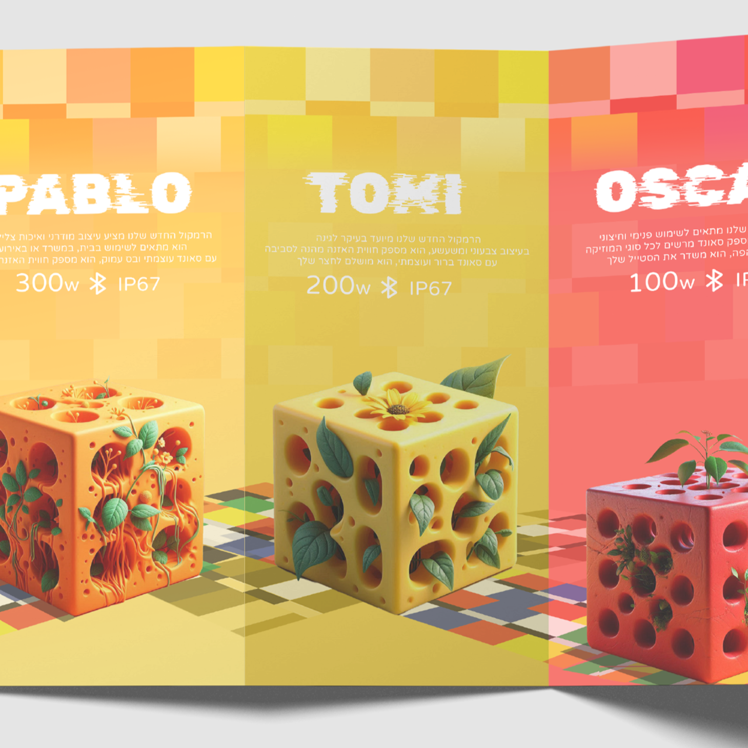 המיתוג של רמקולים לגינה נבנה בהשראת הצבעוניות של קובייה הונגרית - חופשית, צעירה ונועזת. בחרנו בגוונים עזים וקומפוזיציה דינמית שמכניסה חיים לכל חלל פתוח, עם קריצה צעירה, כדי לשמור על תחושת משחק מבלי לאבד סדר. המטרה הייתה ליצור מותג שמרגיש כמו מסיבה קטנה בכל הדלקה של הרמקול